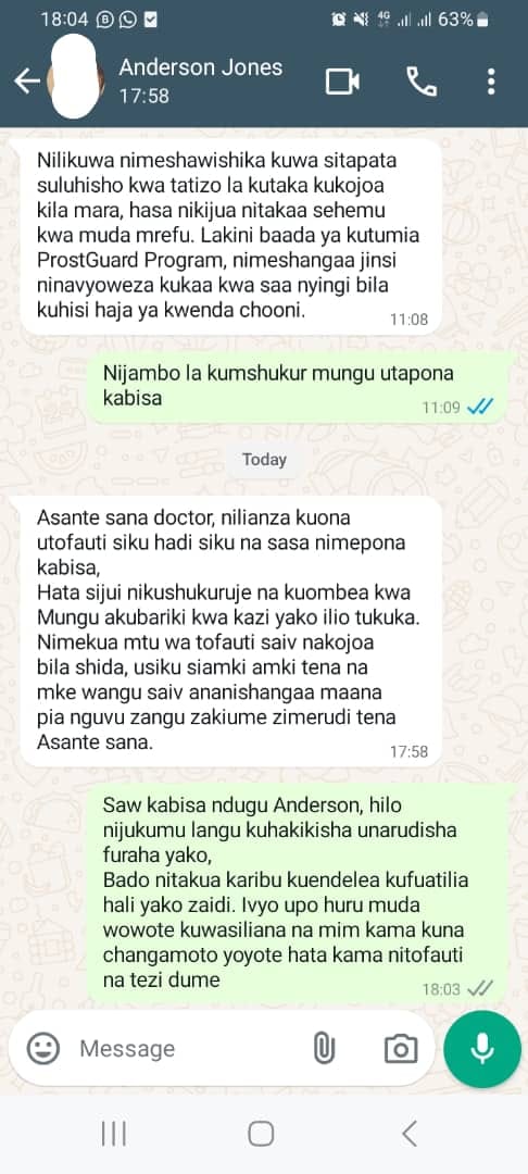 Juma Issa ... kutoka Mwanza Kabla ya kutumia ProstGuard Program, nilikuwa na tatizo sugu la kukojoa mara kwa mara. Nilihisi aibu sana nilipokuwa najiandaa kusafiri au kukutana na marafiki, nikijua sitakuwa na uwezo wa kukaa bila kwenda chooni. Nilikuwa nikisikia huzuni na kukata tamaa. Lakini baada ya kuanza programu hii, nimeshangaa jinsi ninavyoweza kukaa kwa saa nyingi bila kuhisi haja ya kwenda chooni. Nimeweza kurudi kwenye shughuli zangu za kawaida, na sasa ninafurahia maisha yangu tena. Salum Athuman ... kutoka Morogoro ProstGuard Program ni suluhisho la kweli. Nilikuwa nimechoshwa na kuamka mara kadhaa usiku kwenda kukojoa, huku mkojo ukiwa mdogo sana. Kila usiku ulikuwa ni kipande cha mateso. Nilihisi kama ningeishi maisha ya umaskini, nikitafuta usingizi lakini nikiwa na wasiwasi wa kuamka tena. Baada ya kutumia programu hii, sasa nalala usiku mzima bila kuamka hata mara moja. Maisha yangu yamebadilika sana; nina nguvu zaidi katika kazi zangu na nahisi raha kubwa. Abdul Karim ... kutoka Tabora Nina miaka 75, na nilifikiri ProstGuard Program haitakuwa na nguvu za kutosha kwangu. Nilikuwa nimejaribu tiba nyingi, lakini yote yalisababisha tu kutokueleweka zaidi. Nilijawa na maumivu ya mgongo na uvimbe wa tezi dume ulionisumbua sana. Lakini baada ya kutumia programu hii kwa muda, uvimbe umetoweka, maumivu yamepungua, na sasa naweza kufanya shughuli zangu za kila siku bila shida. ProstGuard Program ni tiba bora kabisa kwa matatizo ya uzee; imenifanya nijisikie kijana tena James Peter ... kutoka Iringa Wiki mbili baada ya kuanza kutumia ProstGuard Program, nilienda hospitalini kwa ajili ya vipimo. Niliweza kufika kwenye kliniki nikiwa na matumaini, lakini nilikuwa na wasiwasi pia. Matokeo yalikuwa ya kushangaza; uvimbe ulikuwa umetoweka kabisa! Daktari aliniuliza kwa mshangao, 'Umetumia nini mpaka kuondoa uvimbe bila upasuaji?' Nikamjibu kwa ujasiri, ni programu maalumu inayoitwa ProstGuard Program. Sasa, sina wasiwasi tena, na maisha yangu yamepata mwelekeo mpya.